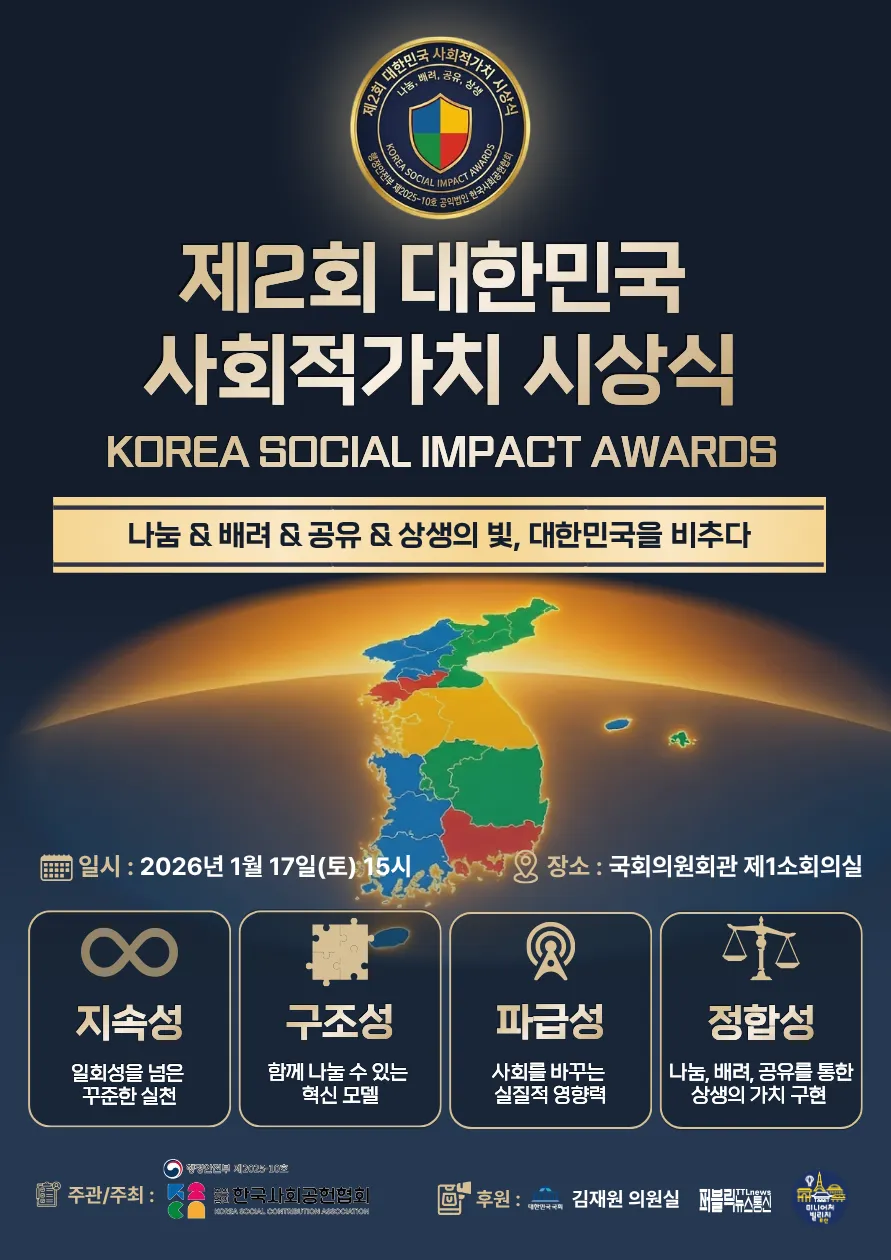행정안전부 소관 공익법인 한국사회공헌협회는 우리 사회 곳곳에서 따뜻한 온기를 전하며 실질적인 변화를 만들어가고 있는 주인공을 모십니다. 2019년부터 이어온 ‘대한민국 사회공헌대상’의 정통성을 엄격히 계승하고, 2025년 행정안전부 제2025-10호 공익법인 승격에 발맞춰 그 위상과 공신력을 새롭게 정립한 ‘제2회 대한민국 사회적가치 시상식(KOREA SOCIAL IMPACT AWARDS)’의 후보자 공모를 시작합니다.